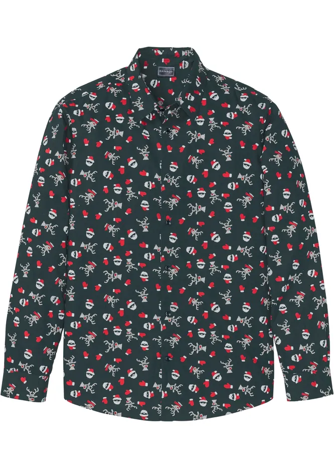 Нижнее белье и личные аксессуары — спорный подарок на Новый год любимому человеку, если ваши отношения только зарождаются. Лучше в таком случае начать с рубашки — тематической и яркой, как эта. Одежда сделана из 100% хлопка, фасон Slim Fit, воротник кент с остроконечными треугольниками. Классика! За исключением принта из красных рукавиц, дерзких оленей и Дедов Морозов в солнцезащитных очках.