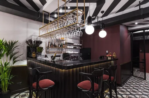 Первый этаж – бистро на 30 мест – союз между строгими, но мягкими элементами модерна и смелой монохромной графикой, которая читается сразу и привлекает внимание даже с улицы. Нижний этаж – бар на 20 мест – много темного дерева и главный арт-объект – разноцветное витражное стекло по авторским эскизам в технике tiffany, безупречное сочетание ретро-стиля и современности.