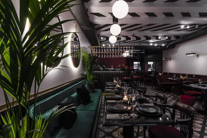 Первый этаж – бистро на 30 мест – союз между строгими, но мягкими элементами модерна и смелой монохромной графикой, которая читается сразу и привлекает внимание даже с улицы. Нижний этаж – бар на 20 мест – много темного дерева и главный арт-объект – разноцветное витражное стекло по авторским эскизам в технике tiffany, безупречное сочетание ретро-стиля и современности.