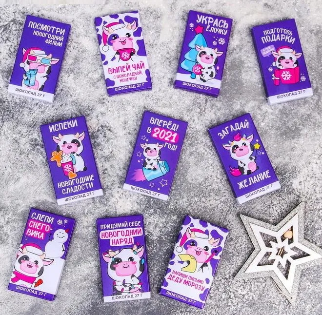 Этот необычный новогодний подарок собрал все атрибуты приятного сюрприза к 2021 году. Раз — тематическое оформление с изображением миловидной коровы, символа года. Два — пожелание с наступающим или уже наступившим. Три — красочный внешний вид. Четыре — инструкции, как подготовиться к празднику или провести каникулы. На каждой обертке шоколада в наборе написано задание для атмосферы: слепить снеговика, загадать желание, посмотреть рождественский фильм или испечь новогодние лакомство. Четыре — десять небольших порций шоколада, чтобы поднять настроение. Вручать такой лучше перед 31 декабря. Но можно и после боя курантов — чтобы не расставаться с праздником как можно дольше.