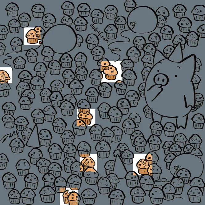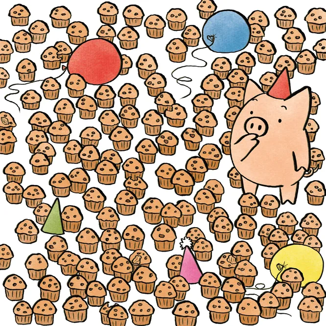 Конечно, поросенку Пигглу надо было дождаться гостей, но он не седержался и попробовал три маффина. Пожалуй, их лучше убрать, чтобы никому не попались. Но удастся ли тебе их заметить?