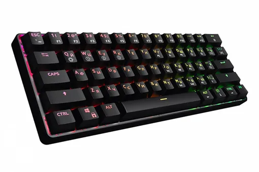 Это специальная игровая клавиатура безумно красивых цветовых решений. Эта вещица относится к очень экстравагантному формату клавиатур — 60. У нее нет не только Num Pad, но и блока стрелок и F-ряда. Это стильно выглядит, очень экономит место на рабочем столе и полностью удовлетворяет большинство геймеров.