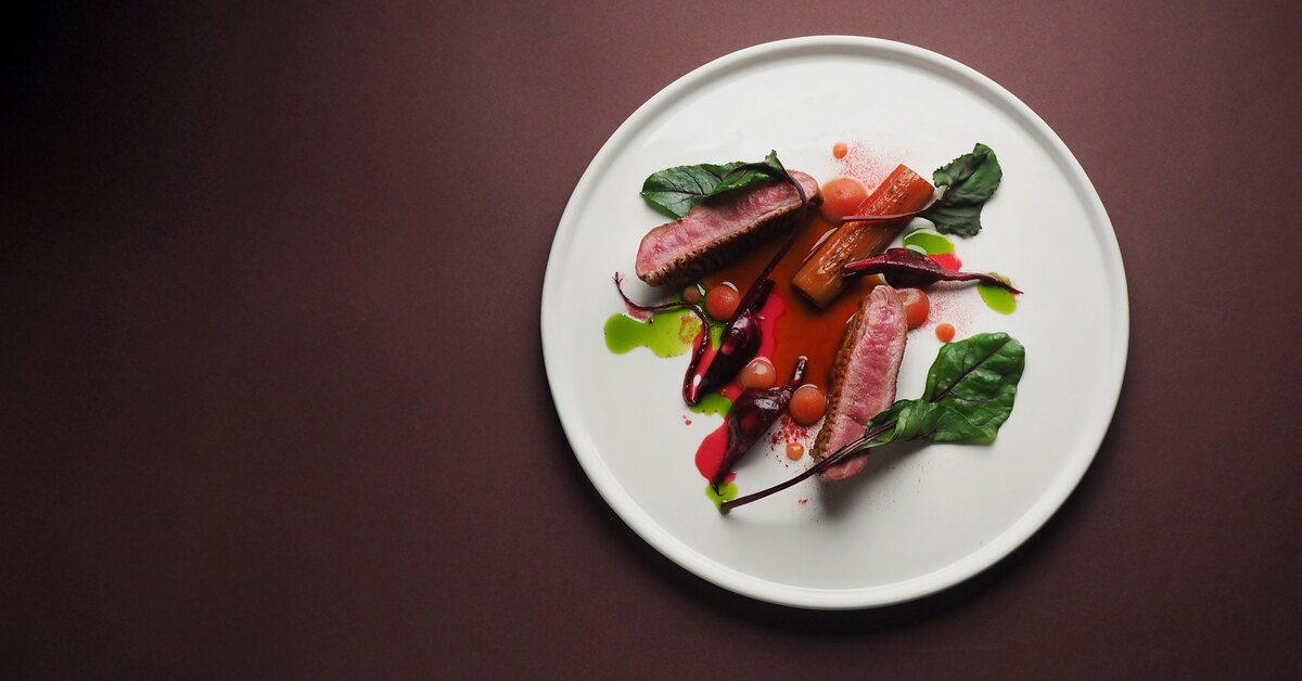 Стоило отвлечься, и на столе уже томится в ожидании нежное филе утиной грудки (950 р.), зажаренное до золотистой корочки в паре с сезонным гарниром: молодая свекла, слегка припущенная свекольная ботва, и ревень, приготовленный при низкой температуре и карамелизованный на манер крем-брюле.