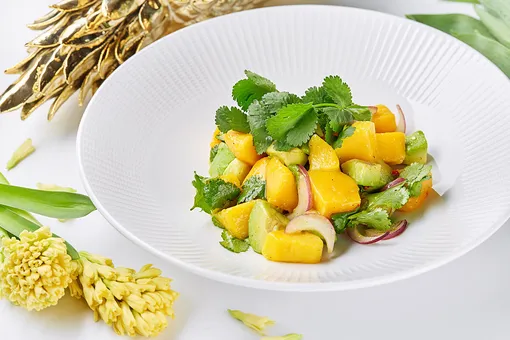 Любители экзотики оценят необычный салат с авокадо и манго (1400 р.), заправка из чили в котором выгодно оттеняет нежность ингредиентов.