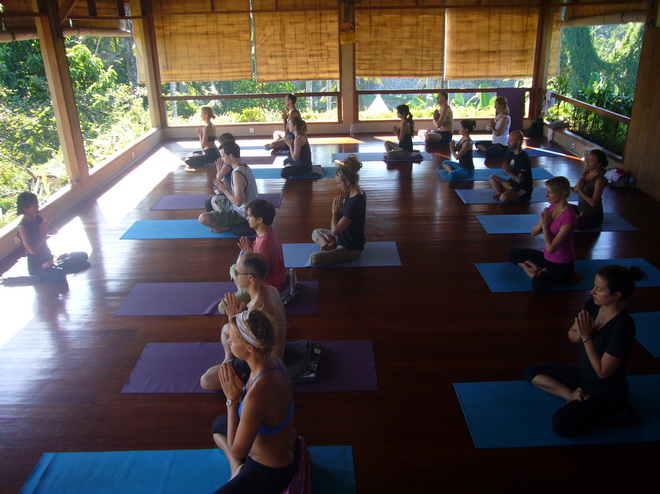 Дорога от туристической Куты занимает около двух часов, и время пролетает незаметно за веселой болтовней с водителем. Больше всего меня умилил его вопрос: «А вы живете в России или на другом острове?» Балийцам со своей островной колокольни кажется, что весь мир держится на островах.В Убуд я отправилась, ничего не забронировав и даже, признаться, не погуглив варианты размещения. Заранее нашла только школу йоги «Йога Барн», а жилье решила снять по соседству. Прибыв прямиком в школу, без проблем поселилась рядом, в гест-хаусе «Убуд Аура». За сравнительно небольшую сумму в моем распоряжении оказался номер с живописным видом на деревню и кондиционером, а также бассейн во внутреннем дворике. И как бонус – соседи-художники, с 6 утра сидящие на перилах нашего этажа со своими холстами. Разместившись, наведалась в «Йога Барн» и за 150 долларов купила на все четыре дня абонемент с неограниченным количеством посещений. На обороте листка с расписанием значился список предлагаемых занятий и рекомендации – кому они предназначены. Но я не стала ничего планировать заранее. Хатха-йога, айенгара, кундалини, пилатес, медитации или голосовые тренинги – для меня было не так важно, чем заняться. Просто хотелось каждый раз действовать по настроению, прислушиваясь к своим ощущениям.
