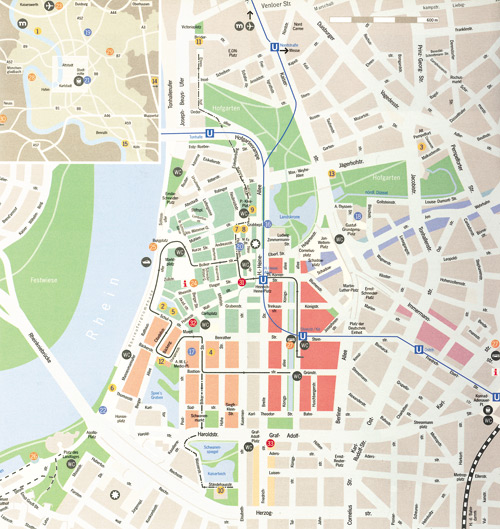 После этого можно приступать к осмотру Старого города (Altstadt – пешеходная зона от Heinrich-Heine-Allee до Рейна). Здесь сложно просчитывать маршруты – за каждым поворотом маленьких улочек может обнаружиться что-то неожиданное: от second-hand с шинелями, кружевами и планшетами до магазина с бессмысленными, но по своему притягательными сувенирами. Здесь нужно гулять, заходить перекусить в ресторанчики с кухней со всех концов света и наблюдать за местными жителями и приезжими, которые знают толк в веселье, не нарушающем общественное спокойствие.