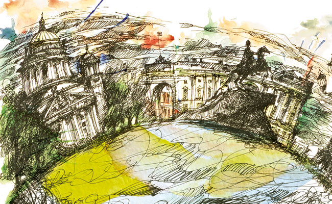 «Не подскажете, далеко до Дворцовой?» — спрашивают туристы, окружив меня на перекрестке Литейного и Владимирского. «Нет, в двух шагах», — отвечаю. Ну хорошо, в трех. Особенно если реками измерять. Фонтанку пересекли, там до Садовой рукой подать; от Садовой до Грибанала (канал Грибоедова) чуть-чуть совсем. Мороженое съесть не успеют, как через Мойку переберутся. Ну и все, в общем, пришли. По Мойке направо, потом налево, вот и машина артиста Боярского у подъезда известного в Петербурге дома стоит как ориентир. Но туристам туда не надо. Им все-таки налево, через мостик. Здравствуй, площадь Дворцовая!