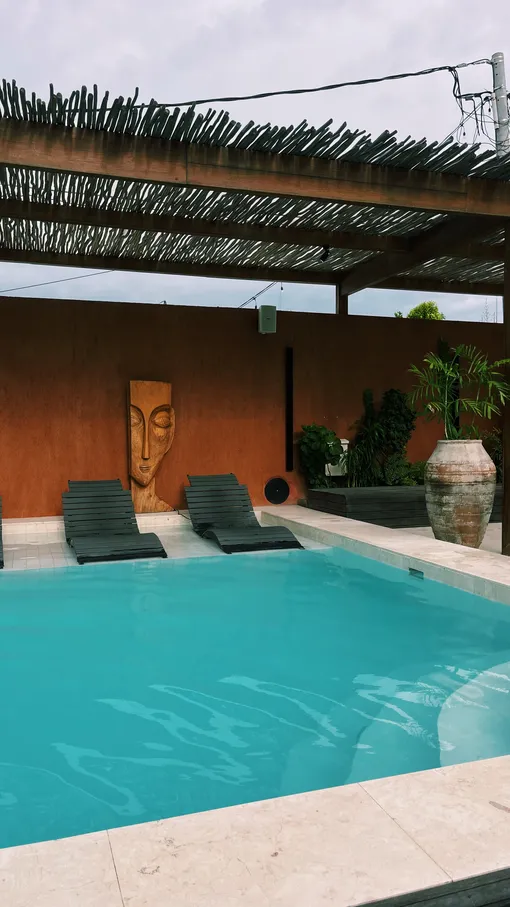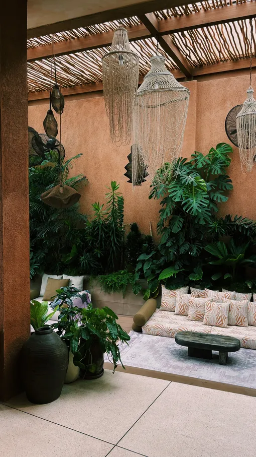 Терракота и теплая глина в сочетании с мягкими диванами цвета альпаки, объемные глиняные вазы, буйство банановых листьев и декоративных пальм. Отсутствие четких границ между интерьером и экстерьером создают ощущение, будто пространство обнимает тебя и укрывает от внешнего мира, даря ощущение безопасности.