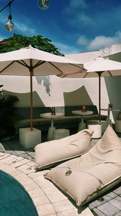 Вместо соломенных крыш и растительного буйства пространство встречает светлым, свежим интерьером, выстроенным на ощущении чистоты и визуального покоя. Здесь нет перегруженности декором: интерьер дышит за счёт света, воздуха и выверенных пропорций.