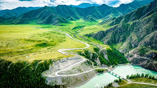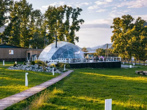 Удобно начать путь с Чемала. Это один из тех вариантов, где знакомство с Алтаем проходит мягко: горы уже рядом, река тоже, но пространство все еще остается пейзажным и спокойным. В этой части маршрута можно выбрать разные форматы размещения, от глэмпингов до небольших купольных отелей. Среди таких примеров — купольный отель «Вдох» и глэмпинг Alteria. Оба варианта подойдут тем, кто хочет провести первые дни поездки ближе к природе, но без лишней бытовой нагрузки.