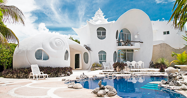 Жители острова Исла-Мухерес в Карибском море сочинили легенду, что этот дом сделан из самой большой ракушки в мире. На самом деле его спроектировал архитектор Эдуардо Окампо вместе со своим братом, мексиканским художником Октавио. Здание выполнено в стиле испанского сюрреализма и напоминает о творчестве Сальвадора Дали. Эксперименты с пространством продолжаются и внутри: диван вырастает из стены, а окна имеют форму капель.