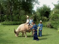 Солнце садится на самом краю бескрайнего рисового поля, тайский человек в соломенной шляпе с большими полями ведет по склону холма двух буйволов – в лучах заходящего солнца один становится абсолютно розовым. На буйволиных спинах сидят наши мальчики. До нас доносятся их вопли восторга – они заглушают даже звон цикад.