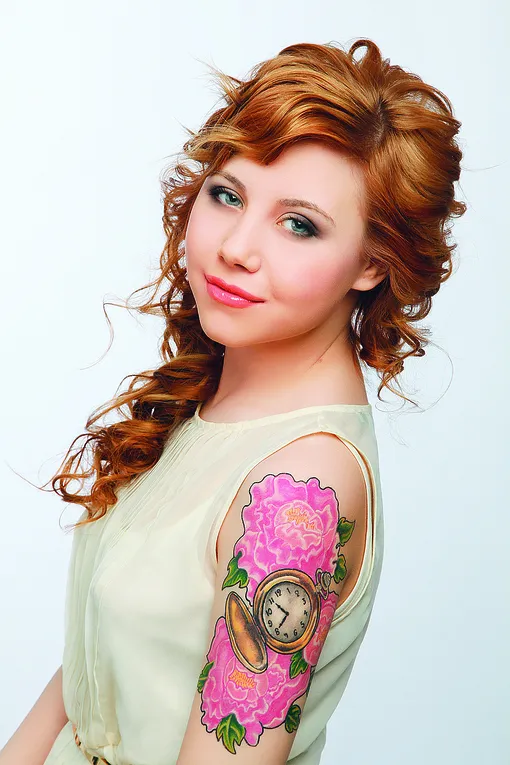 Тату: на плече – пионы и часы в стиле ретро, на руке – птичка.