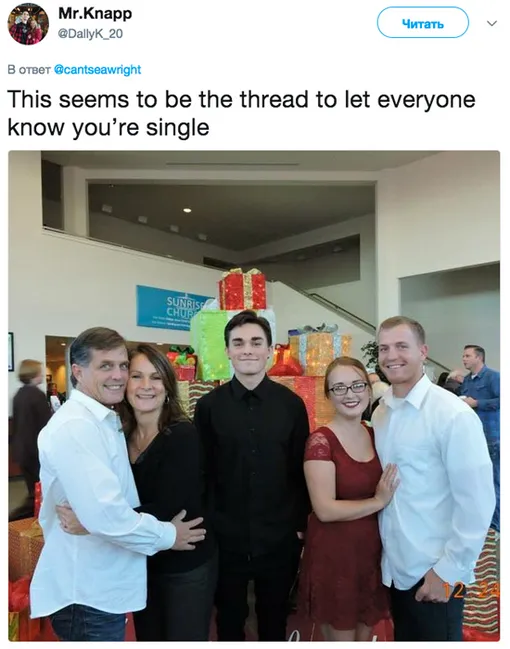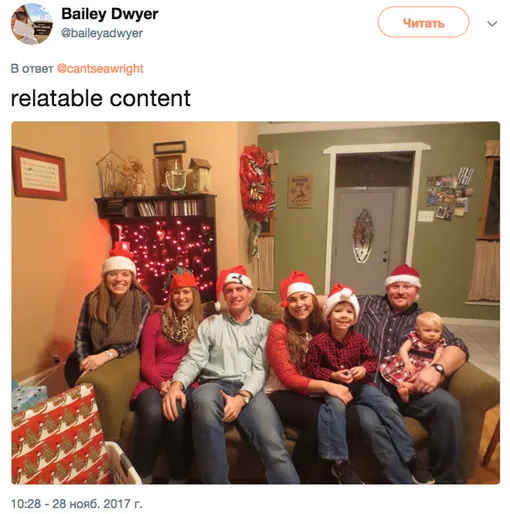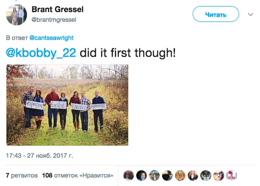 На рождественском снимке изображена семья Эмили с надписями на букву «Е» в руках: у родителей — excited (восхищены), у брата и сестры с партнерами — engaged (обручены) и expecting (в ожидании). А сама девушка гордо держит плакат с надписью «Emily»!