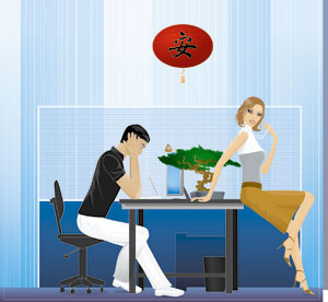 Первая мысль, которая пришла мне в голову, когда я на следующее утро увидел свое рабочее место: «Где я?» Треть стола занимала какая-то кадка с деревом, вокруг нее стояли три разные по размеру стеклянные пирамиды, над столом висел красный бумажный шар с красной же кисточкой-метелкой, а на мониторе развалились два пузатых нэцке. И все это в приторно-сладком дыму того, что почему-то называют благовониями.