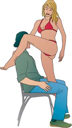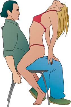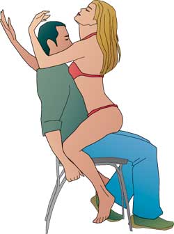 ![]() | 4 Подойди к его стулу, поставь ногу между его ног, а другую закинь ему на плечо – растянись! Обопрись на спинку стула руками и потрись своим телом о партнера, но не позволяй ему дотрагиваться до тебя. |