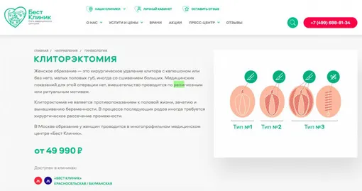 По информации портала Meduza, медицинский центр «Бест Клиник», расположенный недалеко от станции метро «Бауманская», на своем сайте среди прочих услуг предлагал клиторэктомию — женское обрезание. «Медицинских показаний для этой операции нет, вмешательство проводится по религиозным или ритуальным мотивам. Обрезание клитора делают девочкам до начала периода полового созревания, обычно в возрасте от 5 до 12 лет», — сообщалось на сайте клиники.