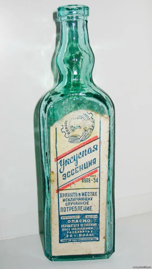 Их выпускали для того, чтобы разливать и продавать в них уксусную эссенцию – концентрированную уксусную кислоту, предназначенную для хозяйственных и кулинарных целей. Эта кислота хоть и считается в химии одной из слабейших, для человека представляет смертельную опасность при употреблении в неразбавленном виде да и попадание ее на кожу приводило к серьезным ожогам.