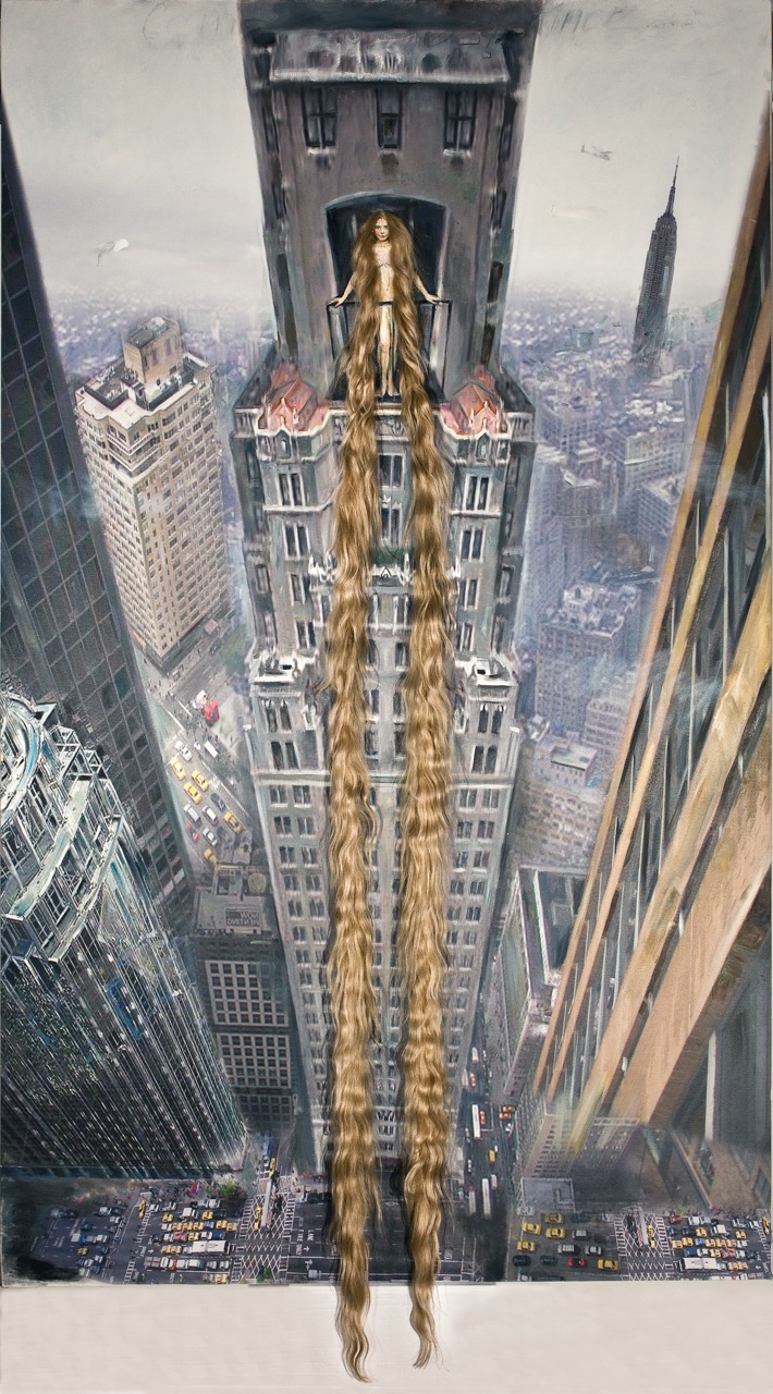Во время моего пребывания в 2008 году в Нью-Йорке произошла трагедия с «русской Рапунцель» – топ-моделью Русланой Коршуновой (топ-модель, спрыгнувшая с балкона своей квартиры на Манхэттене). Мне захотелось передать это головокружительное ощущение мечты, успеха, трагедии, головокружительное ощущение, которое дает Нью-Йорк, – ощущение близости успеха и близости падения. Все мои размышления вылились в серию работ под условным названием «Пленница». На одной из картин можно видеть девушку с длинными волосами (2,5 м, волосы настоящие), на следующей картине она их отрезает. Проект пока находится в стадии разработки, поэтому сейчас довольно трудно описать, как он будет выглядеть в итоге. Могу добавить, что частью проекта станут коллаж с ножницами и инсталляция с балконом.