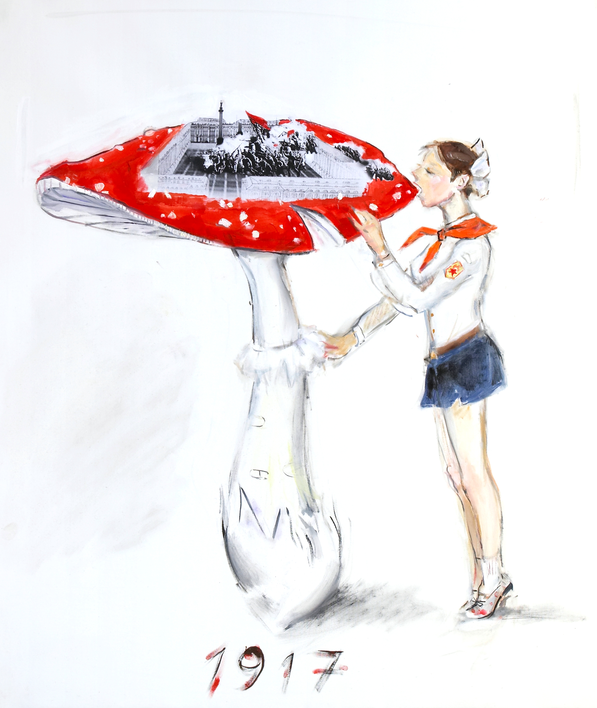Первый мой проект – "Пионерка", состоящий из 15 картин. Это некий диалог с художниками советской эпохи, демонстрирующий восприятие советской действительности юной девушкой-пионеркой, образ которой передает мои размышления о наивности России, попробовавшей красивую, но ядовитую, как показала история, идею о "свободе, равенстве и братстве". Эта очень красивая идея оказалась в итоге губительной, сформировав у мировой общественности представление о советских людях как об агрессивных монстрах. Своими работами я желала развеять это предубеждение, показав истинную сущность этих наивных и романтичных людей.