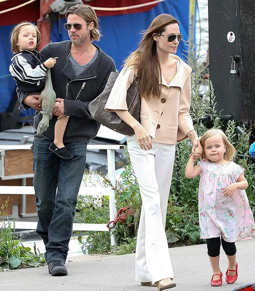 Развелись в 2016 году. В браке родились двойняшки Нокс и Вивьен (в 2008 году). Также у пары есть еще одна биологическая дочка и трое усыновленных детей.