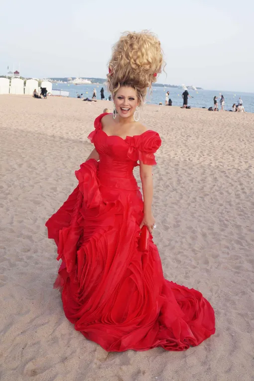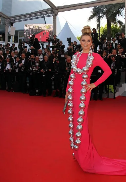 А этот образ постигла печальная участь, знакомая участникам пробок больших городов: Лена опоздала к открытию фестиваля и вместо красной дорожки прогулялась по песку Лазурного берега в платье в виде огромного бутона розы.