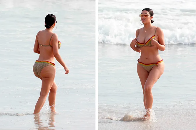 Пока Кардашьян наслаждалась пляжным отдыхом, фотографы успели сделать несколько снимков, на которых можно было разглядеть растяжки на бедрах и целлюлит. Ким заявила, что «компромат» был подделан в фотошопе. Однако переубедить поклонников теледиве так и не удалось: ее затравили в Сети, обвинив в том, что она перестала следить за собой. После скандала Кардашьян решила доказать окружающим, что находится в прекрасной форме: она стала еще внимательнее следить за питанием и чаще посещать спортзал.