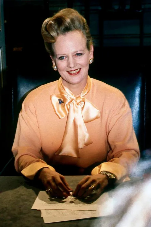 Много лака и кокетливый завиток — такой предстала королева Дании Маргрете во время своего новогоднего обращения в Королевском дворце в 1990 году.