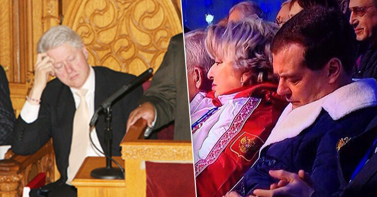 Российские политики не отстают от зарубежных ни в чем, а кое в чем даже превосходят их! А поэтому мы неоднократно могли наблюдать «сонные» видео с их участием. Самое известное и курьезное, пожалуй, то, где Морфей победил Медведева прямо во время церемонии открытия Олимпиады в Сочи. Этот случай стал предметом многочисленных шуток в соцсетях.