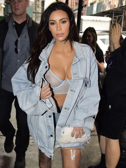 В сентябре 2016-го папарацци подловили знаменитость на улицах Нью-Йорка. Кардашьян была одета в прозрачный светло-голубой бюстгальтер, объемную джинсовую куртку и шорты. Образ Ким дополнила прозрачными ботфортами из коллекции своего на тот момент еще мужа Канье Уэста Yeezy.