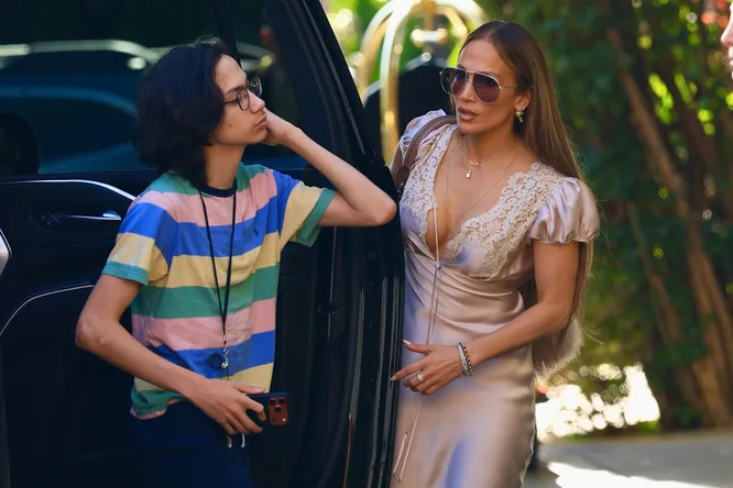 Дженнифер Лопес в платье с глубоким декольте без бюстгальтера вместе с 17-летним сыном поймали папарацци — 7 фото