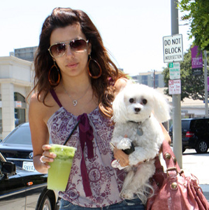 Фотографы засняли Еву, когда она направлялась к салону, держа в одной руке витаминный коктейль, а во второй своего питомца. Одета Ева была просто: летний топ с летним принтом и узкие обтягивающие джинсы.