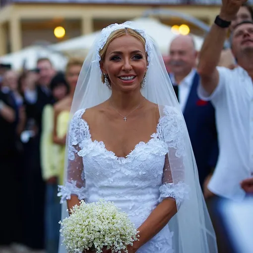 Татьяна пошла к алтарю в платье от Валентина Юдашкина. Дизайнер специально для спортсменки создал наряд из кружева, подчеркивающий ее идеальную фигуру. Для второго дня свадьбы фигуристка выбрала белое платье, укороченное спереди.