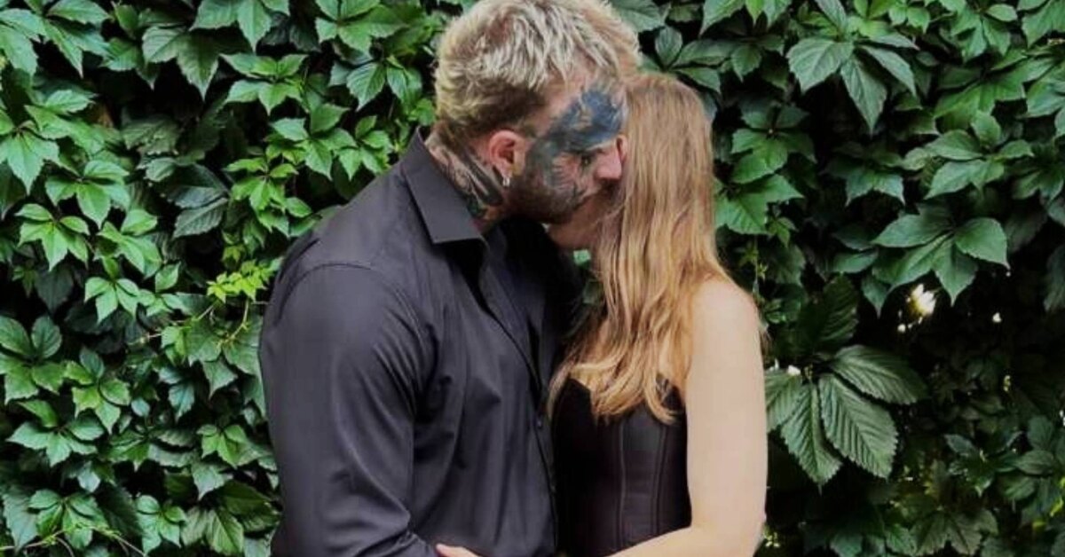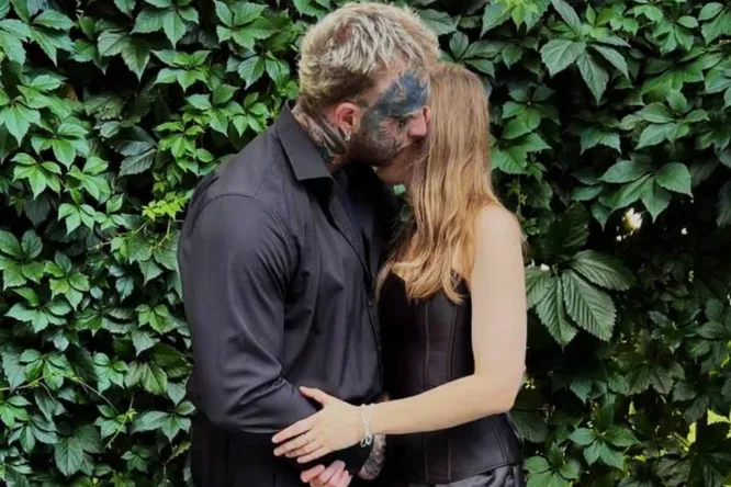 Влюбленные выбрали необычные наряды для свадебного торжества: стиль total black. Шальных предстал в черной рубашке, брюках и кроссовках, а его новоиспеченная жена — в черном корсете, атласных мешковатых брюках того же цвета и ботинках. Молодожены продемонстрировали обручальные кольца.