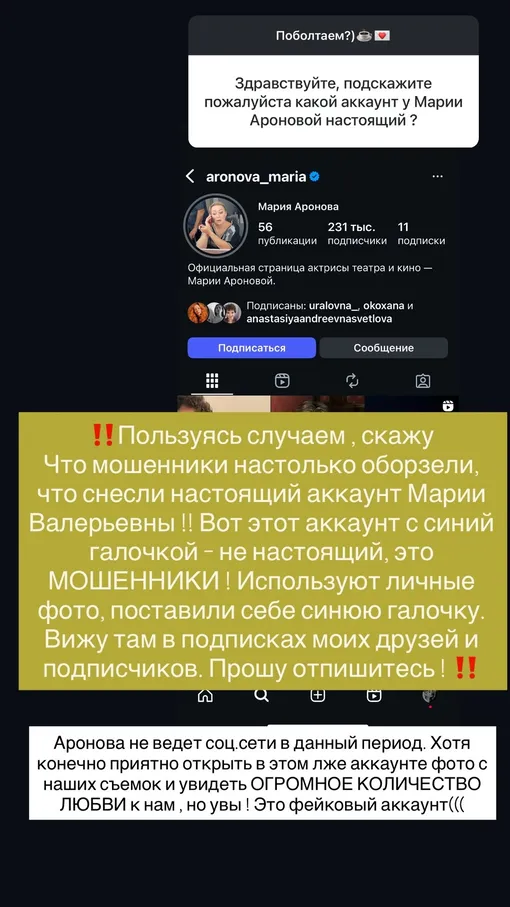 Сегодня партнерша Ароновой по сериалу «Праздники» заявила, что та стала жертвой хакеров. «Мошенники настолько оборзели, что снесли настоящий аккаунт Марии Валерьевны!!! Вот этот аккаунт с синей галочкой – не настоящий, это мошенники! Используют личные фото, поставили синюю себе галочку. Вижу там в подписках моих друзей. Прошу, отпишитесь!» — призвала Анастасия Калашникова.
