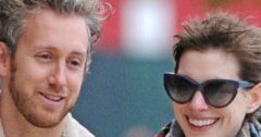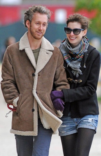 Энн Хэтэуэй и Адам Шульман выглядят так, будто их медовый месяц и не собирается заканчиваться. Счастливая семейная пара гуляет рука об руку в прохладный осенний день.