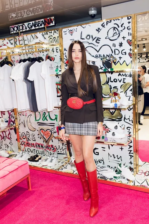 Гостьей мероприятия также стала Анастасия Решетова. Возлюбленная рэпера Тимати появилась на открытии в эффектном соблазнительном наряде: модель надела черный жакет с короткой юбкой в клетку. Образ Анастасия дополнила яркими красными сапогами и поясной сумкой Gucci.
