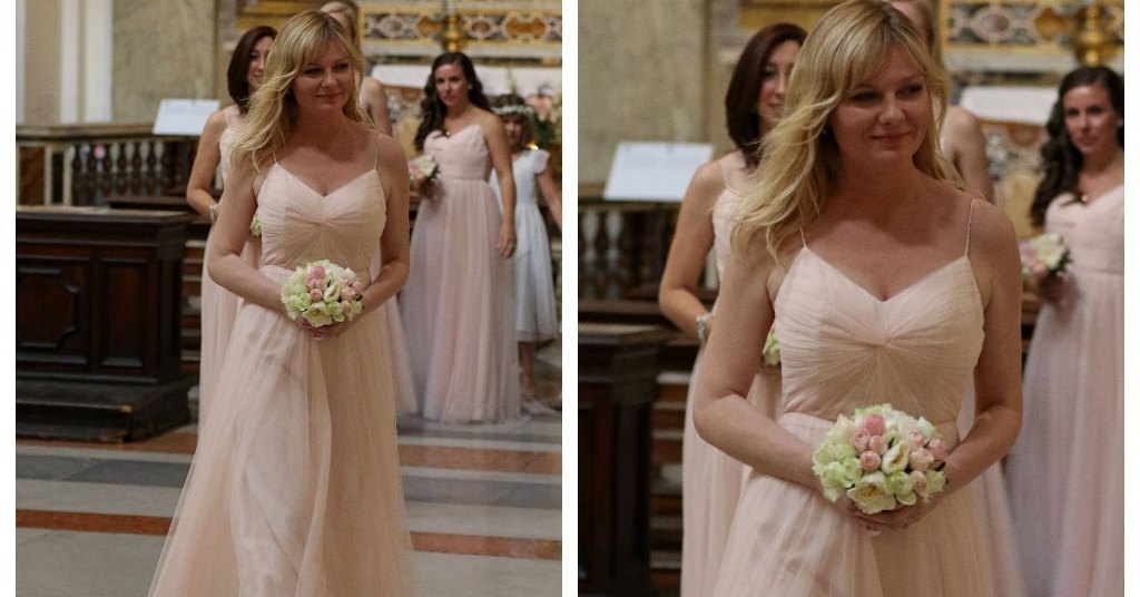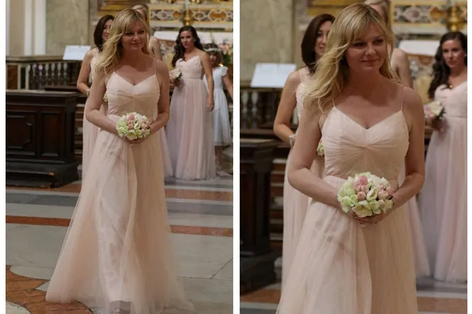 Образ подружки невесты Кирстен примеряет не в первый раз: в 2012 году актриса сыграла подругу в фильме «Холостячки» (Bachelorette). Правда, в кадре звезда появлялась преимущественно в коротком платье, но на церемонию бракосочетания в Риме она приехала в скромном пудровом макси-платье на бретелях.