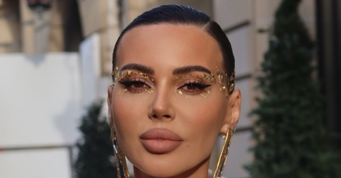 Жена рэпера Джигана сделала гладкую укладку, собрав длинные темные волосы в пучок. Она нанесла яркий макияж с эффектным золотым напылением. Оксана надела белый костюм: жакет с глубоким декольте на голое тело и мини-юбку.