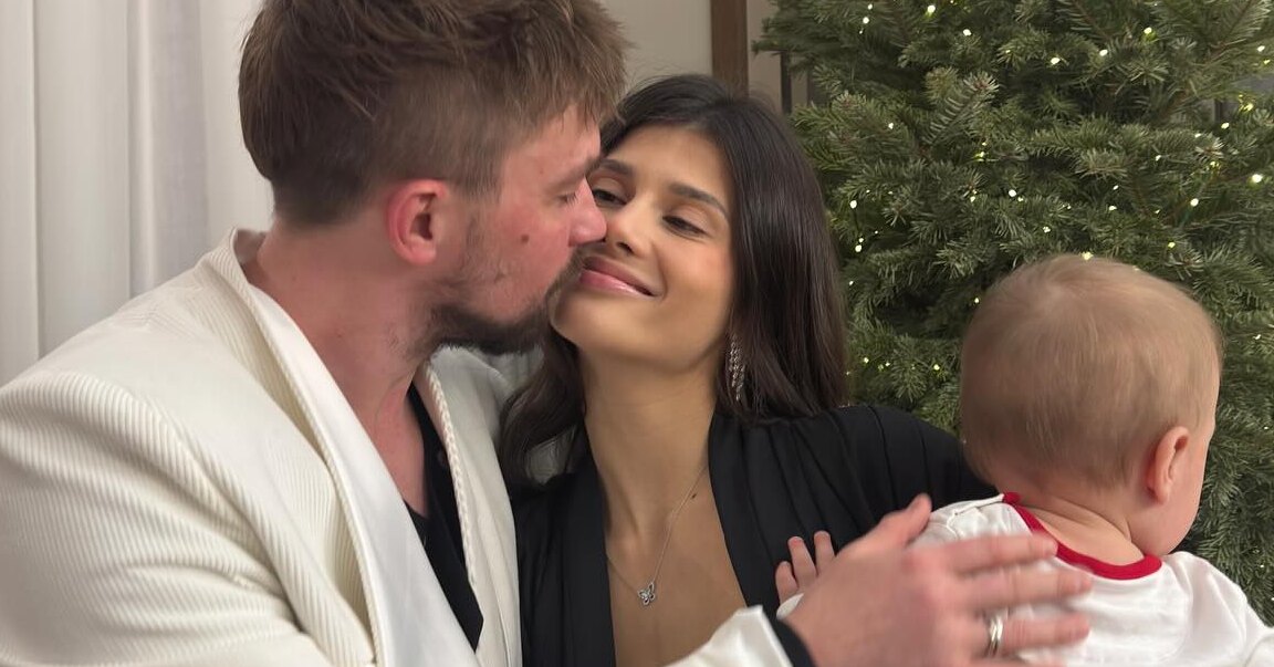 Супруги нарядили маленького сына в забавные штанишки с изображением оленя. На одном кадре Александр и Виктория поцеловались, а на другом фото малыш с любопытством изучал красиво запакованные подарки под чутким руководством папы.