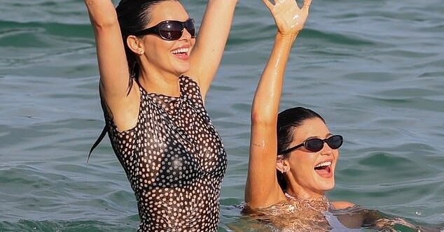 Кендалл родемонстрировала стройную фигуру в черном бикини, которое она сочетала с прозрачным платьем в горошек. Сестер сопровождала компания друзей. Вместе они резвились в воде после полуденных коктейлей в клубе.