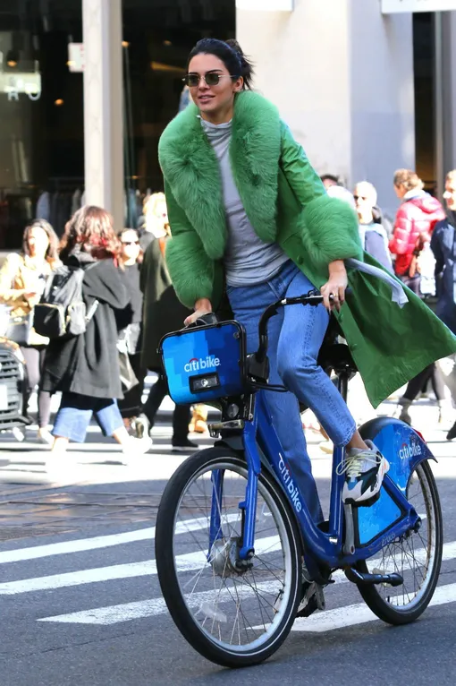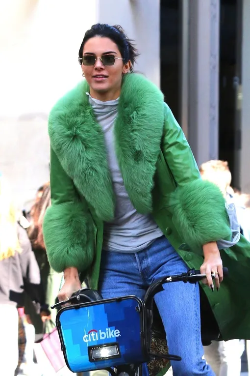 Так, папарацци удалось заметить звезду в ее день рождения в Нью-Йорке: Кендалл каталась на велосипеде. Модель выбрала яркий и комфортный образ для прогулки: она надела зеленое пальто с меховым воротником, под которым оказался трикотажный свитер и джинсы.