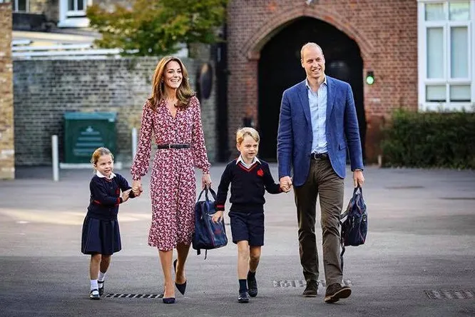 Кейт выбрала пестрое платье ниже колена с изящным черным поясом и темные туфли-лодочки. Ее супруг надел голубую рубашку, синий пиджак и коричневые брюки. Супруги помогали детям нести учебники – Кейт держала в руке рюкзак дочери, а Уильям — портфель сына.
