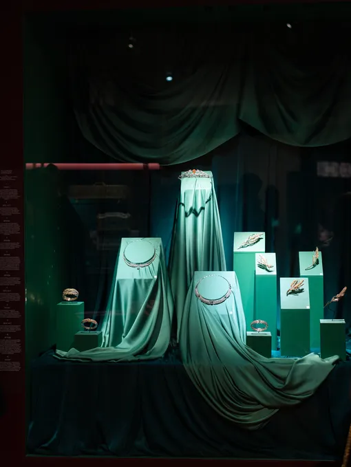 Значимая страница выставки посвящена драгоценным экспонатам ювелирного дома MIUZ Diamonds. На ней представлены украшения прошлого века из собрания музея, а также две современные коллекции.