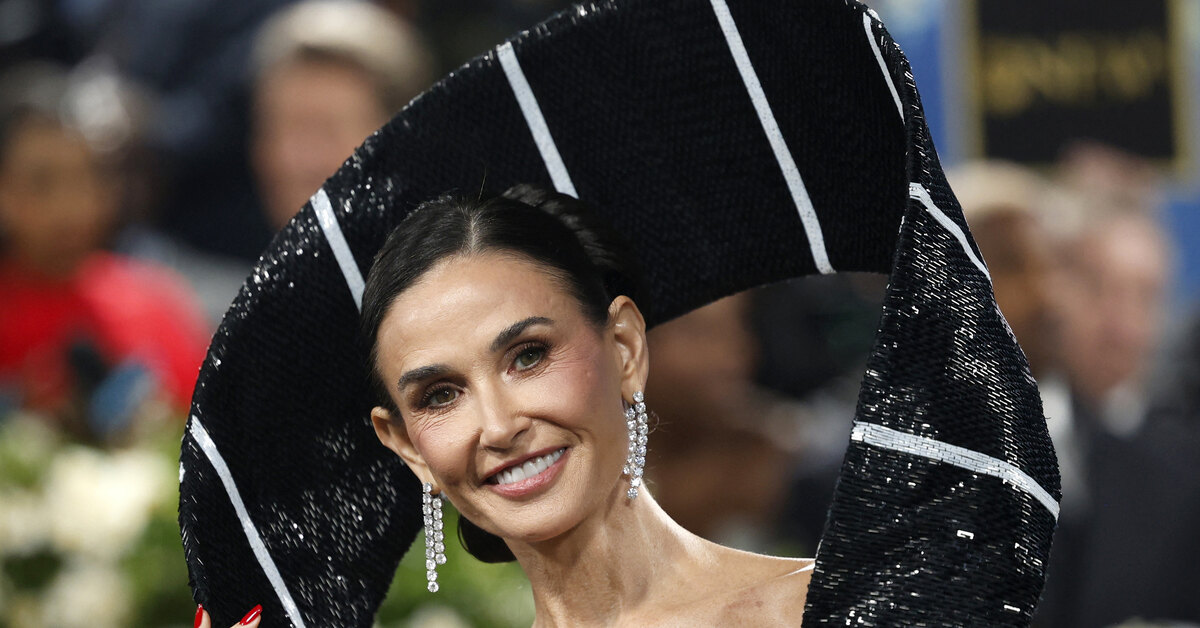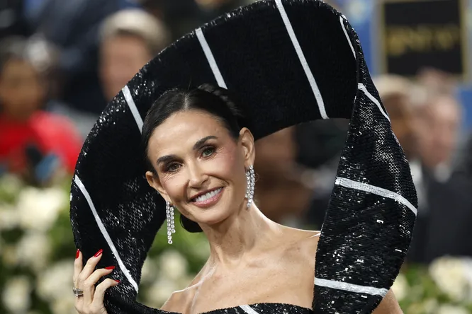 Звезда фильма «Субстанция» позировала, демонстрируя необычную форму наряда — издалека платье Деми напоминало небрежно повязанный галстук. Мур интерпретировала идею мероприятия, представ в образе главного модного акцента темнокожего денди.
