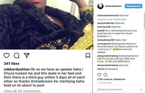 Роб поделился снимком любовника бывшей. Кадр был сделан именно в той кровати, где раньше Роб спал с Блэк. Этот факт очень огорчил преданного мужчину: «Этот чувак выложил вот такое фото из кровати, в которой мы с Чайной зачали нашего ребёнка. Я вам потом покажу сообщения от этого парня, в которых он просит встречи со мной, иначе расскажет какую-то гадость про Чайну прессе, чтобы заработать бабла. Она проститутка. И так было всегда», — разоткровенничался Кардашьян.
