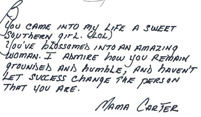 А свекровь, Глория Картер оставила вот такие слова: «Би, ты пришла в мою жизнь светлой южной девчонкой. Теперь ты — восхитительная женщина. Я любуюсь тем, как при этом ты остаешься такой простой и уверенной в себе и не позволяешь успеху изменить себя. Твоя мама Картер».