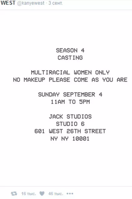 Причиной горячих обсуждений стало объявление Канье Уэста о поиске моделей для участия в показе его коллекции Yeezy Season 4, который состоится на Неделе моды в Нью-Йорке. В Twitter Уэст написал, что требуются исключительно мультирасовые модели. А это означает, что «белые» и чернокожие манекенщики не принимаются. «Только мультирасовые модели. Пожалуйста, никакого мейкапа, приходите такими, какие вы есть», — написал Канье.