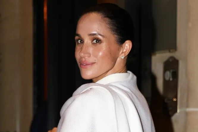 Невестка британского короля составила белый тотал-лук для светского выхода. Она надела кейп и свободные брюки. Меган активно здоровалась с гостями модного шоу, общаясь со звездными друзьями под прицелами камер.