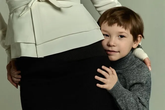 Мальчик тоже был одет в сдержанном стиле - мама выбрала для Леона серый свитер и черные брюки классического кроя. Первенец Галич трогательно прижался к коленям родительницы, обнимая ее руками. На отдельных фото сын строил смешные рожицы, улыбался и кривлялся.